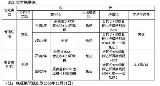 对于卖家来说,出售非普通住宅时,不管购买与出售时间间隔长短,一律要缴纳营业税和二手房个税,只是税率有所不同。不满两年的,营业税标准为合同价的5.55%,超过两年的,则为买卖差价的5.55%。不过二手房个税纳税标准与年限没有关系,不管是否超过两年,都按合同价的2%或者净利润的20%标准征收,如果是出售唯一一套住宅,超过两年的二手房个税可以免征。当然,交易手续费也是免不了的,就上海而言,是按照面积大小来收取,一般每平方米收取2.5元。